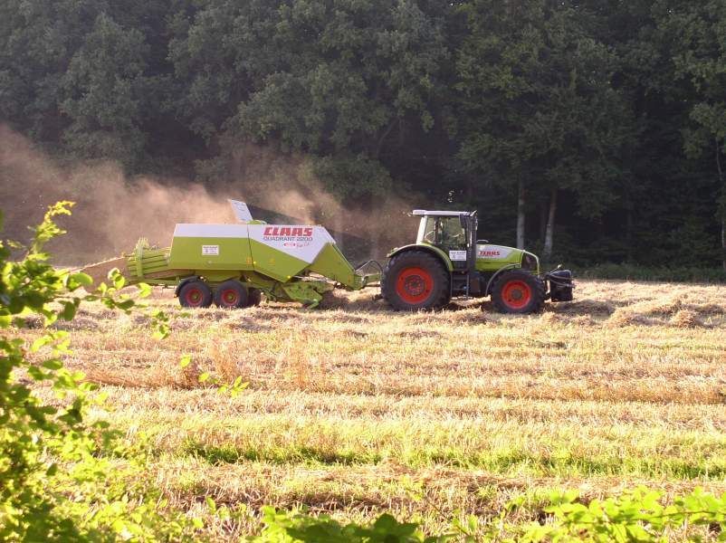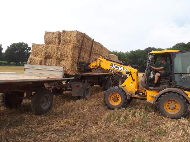 Bilder links: Getreidefeld, Strohballen, Strohpresse, Radlader beim Pressen sammeln, Stroh verladen