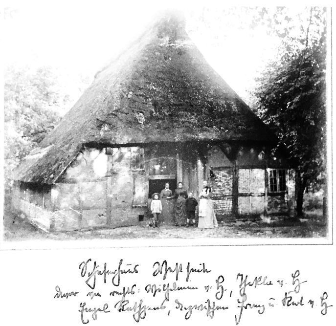 "Dies ist das älteste Bild von unserem Schäferhaus. Es ist um 1888 entstanden, und man sieht darauf Wilhelmine von Holleuffer, (Dr. Peter Brümmel's Urgroßmutter), Thekla von Holleuffer (Schwester von Dr. Peter Brümmel's Urgroßvater), Franz und Karl von Holleuffer (2 Brüder von Dr. Peter Brümmel's Großvater) sowie Engel Rathgen.